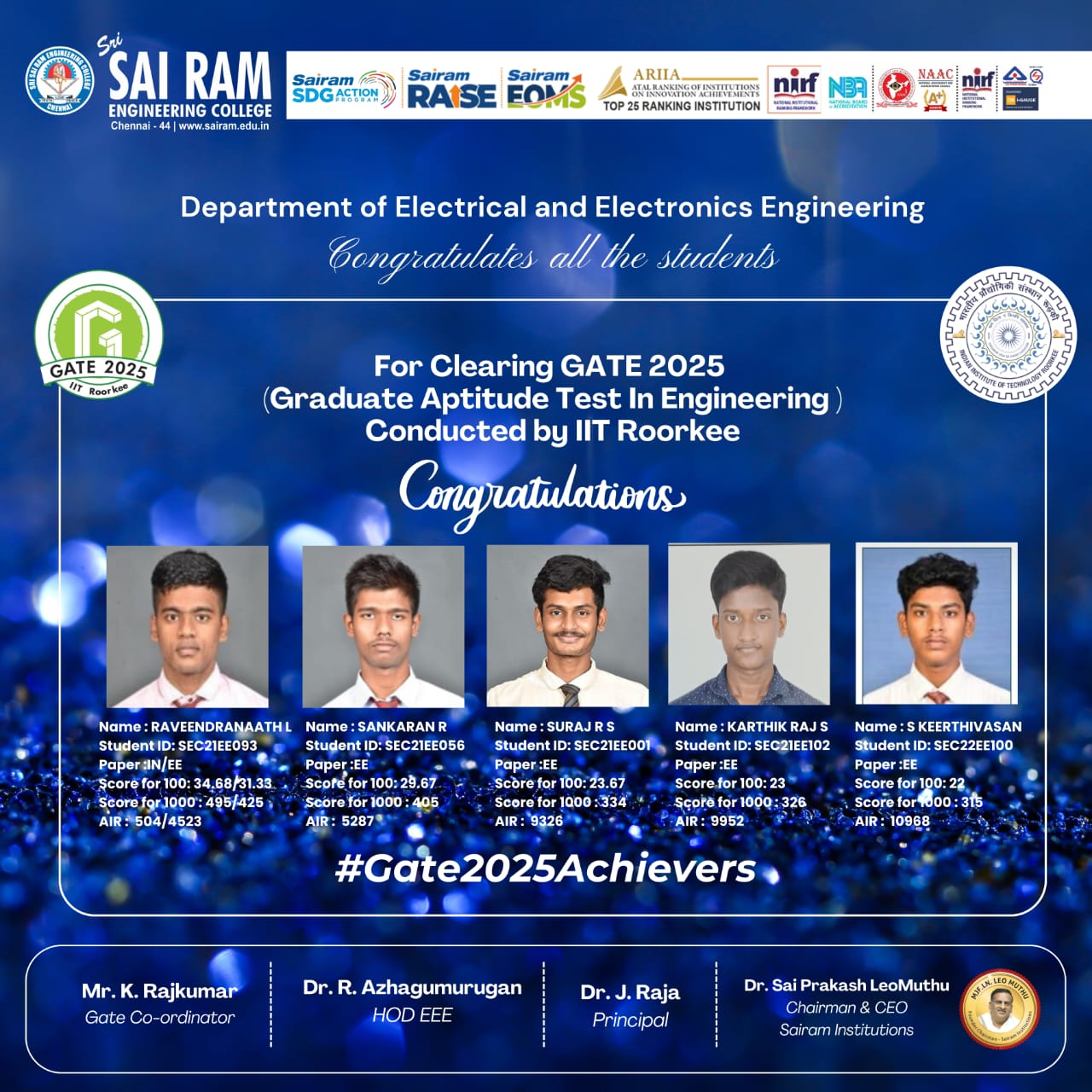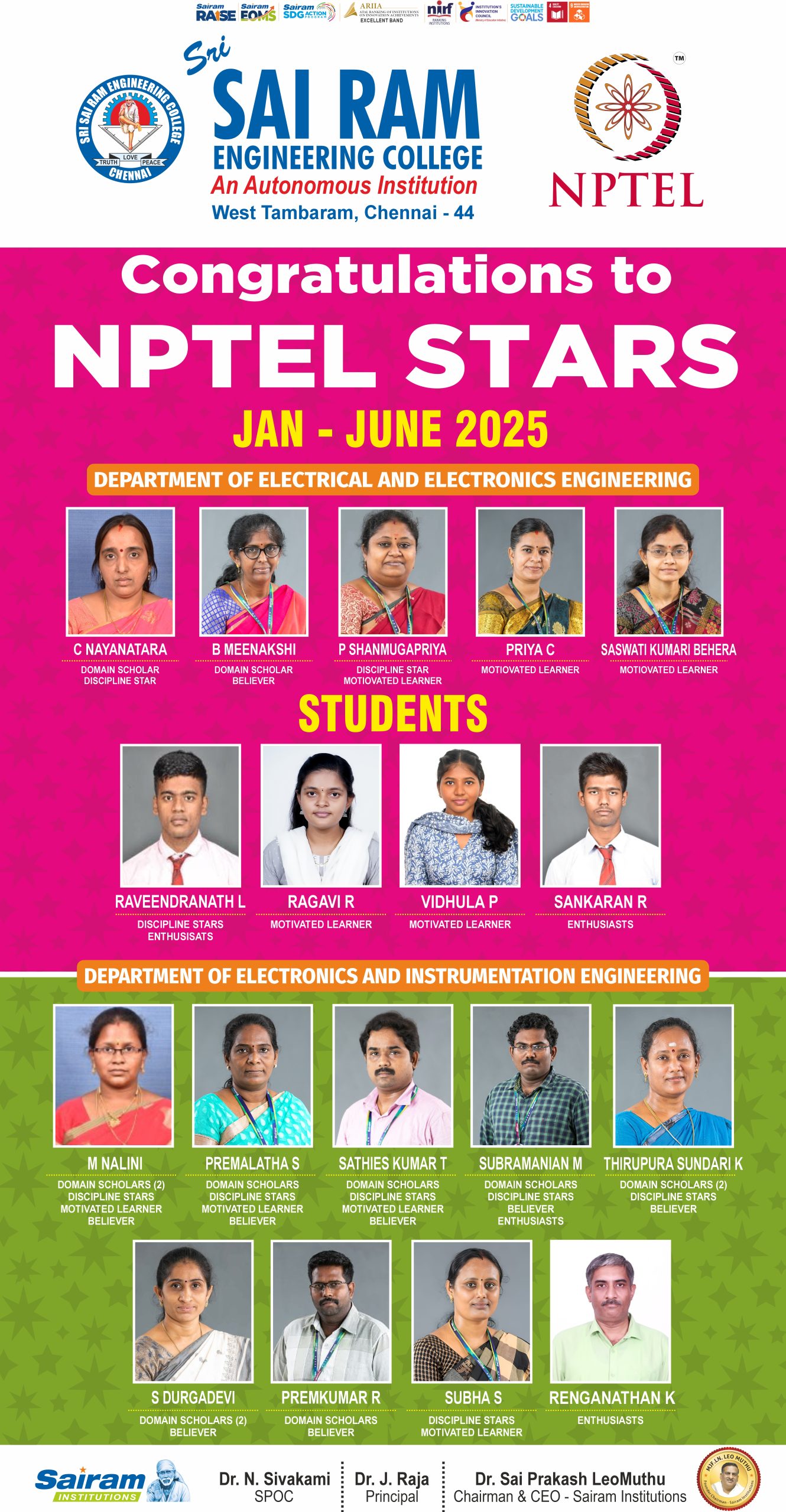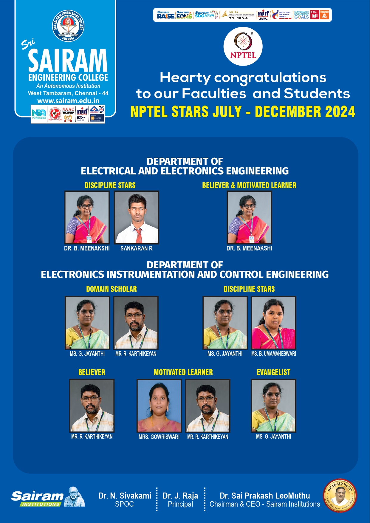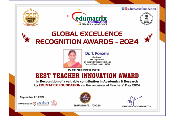 Stafford University UK, British council, Tamil Nadu Government, Education Matters and JPR Engineering college Awarded “The Best Teaching in Engineering Award” to the EEE Department of Sri Sai Ram Engineering College Chennai – 44 on 03.03.2014.